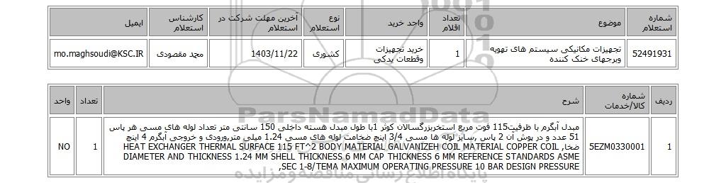 | 52491931 | تجهیزات مکانیکی سیستم های تهویه وبرجهای خنک کننده | 1 | خرید تجهیزات وقطعات یدکی | کشوری | 1403/11/22 | محمد مقصودی | mo.maghsoudi@KSC.IR |