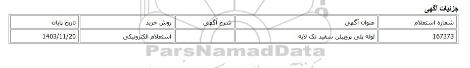 | 167373 | لوله پلی پروپیلن سفید تک لایه | استعلام الکترونیکی | 1403/11/20 |