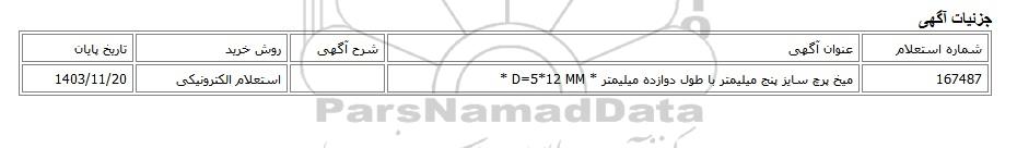 | 167487 | میخ پرچ سایز پنج میلیمتر با طول دوازده میلیمتر * D=5*12 MM * | استعلام الکترونیکی | 1403/11/20 |