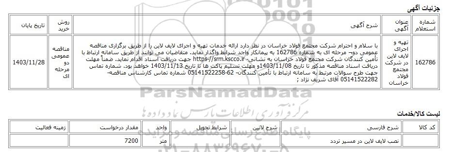 | 162786 | تهیه و اجرای لایف لاین در شرکت مجتمع فولاد خراسان | با سلام و احترام شرکت مجتمع فولاد خراسان در نظر دارد ارائه خدمات تهیه و اجرای لایف لاین را از طریق برگزاری مناقصه عمومی دو¬ مرحله ای به شماره 162786 به پیمانکار واجد شرایط واگذار نماید. متقاضیان می توانند از طریق سامانه ارتباط با تأمین کنندگان شرکت مجتمع فولاد خراسان به نشانی- https-//srm.kscco.ir جهت دریافت اسناد اقدام نماید. ضمناً مهلت دریافت اسناد مناقصه مذکور تا تاریخ 1403/11/08و مهلت تسلیم پاکت ها تا تاریخ 1403/11/13 خواهد بود. شماره تماس جهت طرح سوالات مرتبط به سامانه ارتباط با تأمین کنندگان- 62-05141522258 شماره تماس کارشناس مناقصه- 05141522282 آقای شریف نژاد ; | مناقصه عمومی دو مرحله ای | 1403/11/28 |