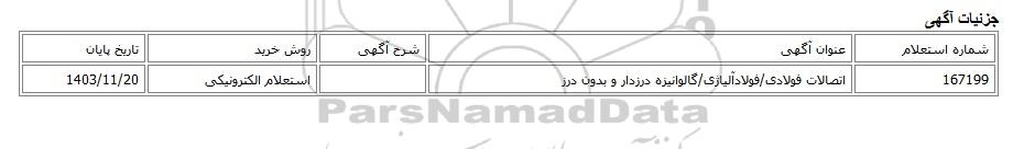 | 167199 | اتصالات فولادی/فولادآلیاژی/گالوانیزه درزدار و بدون درز | استعلام الکترونیکی | 1403/11/20 |
