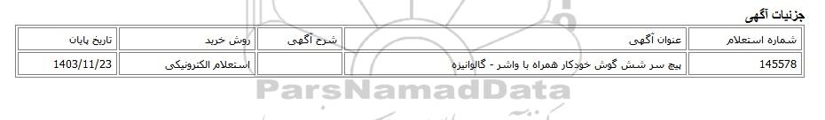 | 145578 | پیچ سر شش گوش خودکار همراه با واشر - گالوانیزه | استعلام الکترونیکی | 1403/11/23 |