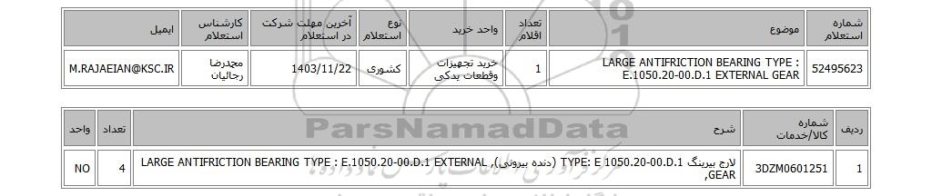 52495623LARGE ANTIFRICTION BEARING TYPE : E.1050.20-00.D.1 EXTERNAL GEAR 1خرید تجهیزات وقطعات یدکیکشوری1403/11/22محمدرضا رجائیانM.RAJAEIAN@KSC.IR