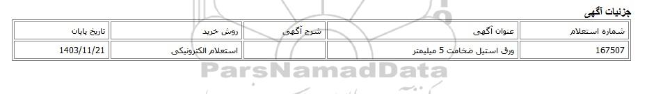 | 167507 | ورق استیل ضخامت 5 میلیمتر | استعلام الکترونیکی | 1403/11/21 |