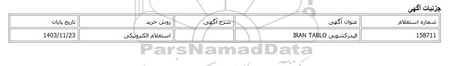 | 158711 | فیدرکشویی IRAN TABLO | استعلام الکترونیکی | 1403/11/23 |