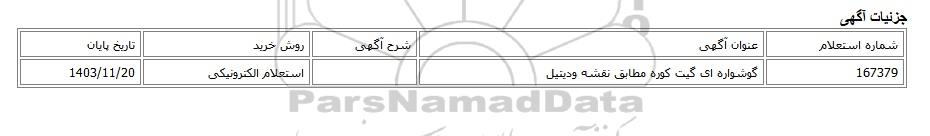 | 167379 | گوشواره ای گیت کوره مطابق نقشه ودیتیل | استعلام الکترونیکی | 1403/11/20 |