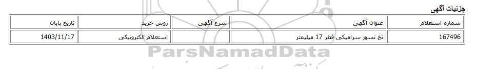 | 167496 | نخ نسوز سرامیکی قطر 17 میلیمتر | استعلام الکترونیکی | 1403/11/17 |