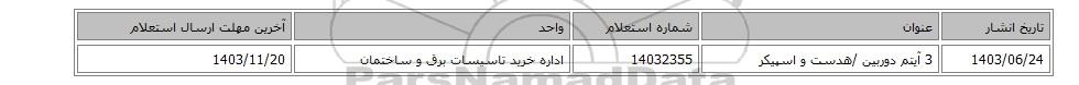 | 1403/06/24 | 3 آیتم دوربین /هدست و اسپیکر | 14032355 | اداره خرید تاسیسات برق و ساختمان | 1403/11/20 |