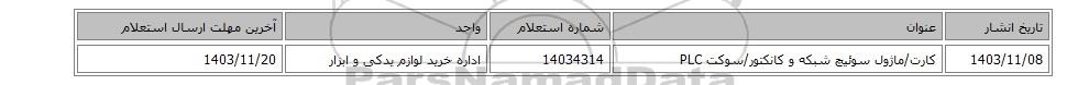 | 1403/11/08 | کارت/ماژول سوئیچ شبکه و کانکتور/سوکت PLC | 14034314 | اداره خرید لوازم یدکی و ابزار | 1403/11/20 |