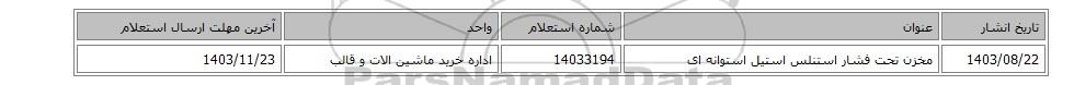 | 1403/08/22 | مخزن تحت فشار استنلس استیل استوانه ای | 14033194 | اداره خرید ماشین الات و قالب | 1403/11/23 |