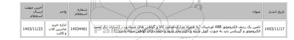 | 1403/11/17 | تامین یک ردیف الکتروموتور ABB اورجینال (به همراه مدارک اصالت کالا و گواهی های مبداء و ... (شایان ذکر است الکتروموتور و گیربکس باید به صورت کوپل شده و آکبند وارد شود و حتمآ دارای گواهی مبداء باشد.)) | 14034461 | اداره خرید ماشین الات و قالب | 1403/11/23 |