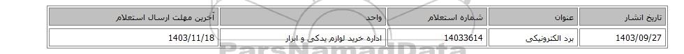 | 1403/09/27 | برد الکترونیکی | 14033614 | اداره خرید لوازم یدکی و ابزار | 1403/11/18 |