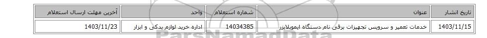| 1403/11/15 | خدمات تعمیر و سرویس تجهیزات برقی نام دستگاه ایموبلایزر | 14034385 | اداره خرید لوازم یدکی و ابزار | 1403/11/23 |