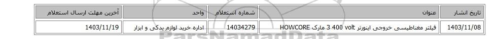 1403/11/08فیلتر مغناطیسی ‎خروجی اینورتر‏ ‎400 volt‏ ‎3 مارک HOWCORE14034279اداره خرید لوازم یدکی و ابزار1403/11/19