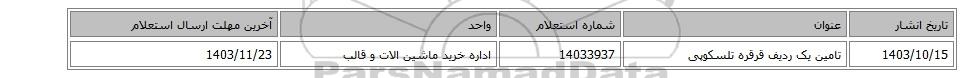 | 1403/10/15 | تامین یک ردیف قرقره تلسکوپی | 14033937 | اداره خرید ماشین الات و قالب | 1403/11/23 |
