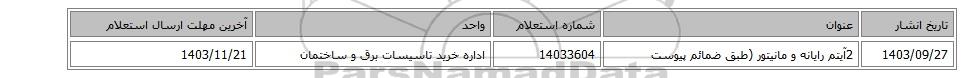 | 1403/09/27 | 2آیتم رایانه و مانیتور (طبق ضمائم پیوست | 14033604 | اداره خرید تاسیسات برق و ساختمان | 1403/11/21 |