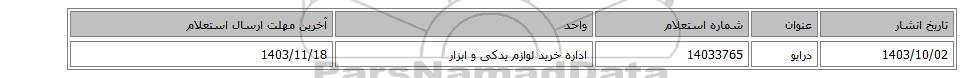 | 1403/10/02 | درایو | 14033765 | اداره خرید لوازم یدکی و ابزار | 1403/11/18 |