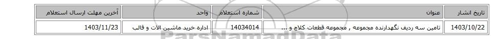 | 1403/10/22 | تامین سه ردیف نگهدارنده مجموعه , مجموعه قطعات کلاچ و ... | 14034014 | اداره خرید ماشین الات و قالب | 1403/11/23 |