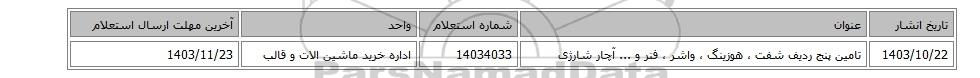 استعلام بها و موضوع استعلام تامین پنج ردیف شفت ، هوزینگ ، واشر ، فنر و ... آچار شارژی به اطلاع کلیه شرکتها و افراد متخصص واجد شرایط میرساند، آگهی گذار در نظر دارد از طریق استعلام بها، نسبت به انتخاب و دریافت پیشنهادات اقدام نماید. این استعلام با کد آگهی ثبت شده در سامانه خبرگزاری پارس نماد : 8645589 منتشر شده است. مشخصات استعلام : تاریخ شروع استعلام: 1403/11/18 آخرین مهلت ارسال پیشنهاد قیمت : 1403/11/23 و محل اجرای پروژه : استان تهران میباشد. استعلام قیمت مورد درخواست : تامین پنج ردیف شفت ، هوزینگ ، واشر ، فنر و ... آچار شارژی با دستهبندیهای تخصصی و گروه های مرتبط : ابزار و یراق آلات, انواع فنر, انواع شیلنگ, قطعات لاستیکی, لوله و اتصالات, تجهیزات و ماشین آلات صنعتی, قطعات خودرو, استعلام اطلاع رسانی میگردد.