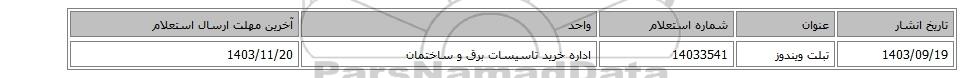 | 1403/09/19 | تبلت ویندوز | 14033541 | اداره خرید تاسیسات برق و ساختمان | 1403/11/20 |