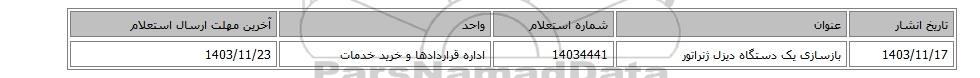 | 1403/11/17 | بازسازی یک دستگاه دیزل ژنراتور | 14034441 | اداره قراردادها و خرید خدمات | 1403/11/23 |