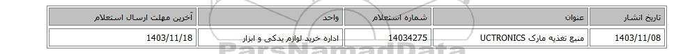 | 1403/11/08 | منبع تغذیه مارک UCTRONICS | 14034275 | اداره خرید لوازم یدکی و ابزار | 1403/11/18 |