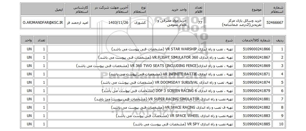 | 52466667 | خرید وسائل بازی مرکز تفریحی(2درصد ضمانتنامه) | 77 | خرید مواد مصرفی و اقلام عمومی | کشوری | 1403/11/26 | امید ارجمند فر | O.ARJMANDFAR@KSC.IR |