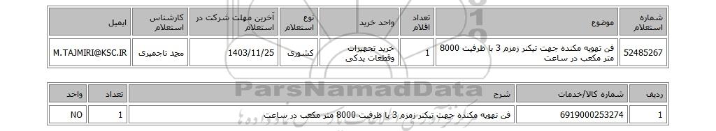 | 52485267 | فن تهویه مکنده جهت تیکنر زمزم 3 با ظرفیت 8000 متر مکعب در ساعت | 1 | خرید تجهیزات وقطعات یدکی | کشوری | 1403/11/25 | محمد تاجمیری | M.TAJMIRI@KSC.IR |