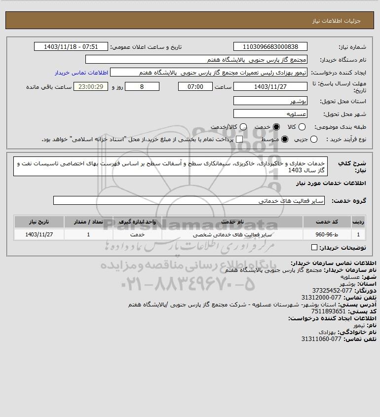 شرح کلی نیاز: خدمات حفاری و خاکبرداری، خاکریزی، سیمانکاری سطح و آسفالت سطح