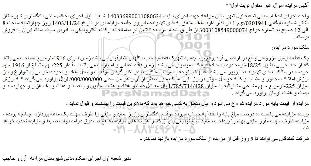 واحد اجرای احکام مدنی شعبه اول شهرستان مراغه جهت اجرای نیابت 140336990011080634 شعبه اول اجرای احکام مدنی دادگستری شهرستان الشتر شماره بایگانی 0301941/ج.م 1 در نظر دارد ملک متعلق به آقای محمد وندصابرپور جلسه مزایده ای در تاریخ 1403/11/24 روز چهارشنبه ساعت 8 الی 12 صبح به شماره حراج 3003108549000074 از طریق انجام مزایده آنلاین در سامانه تدارکات الکترونیکی به آدرس سایت ستاد ایران به فروش برساند.