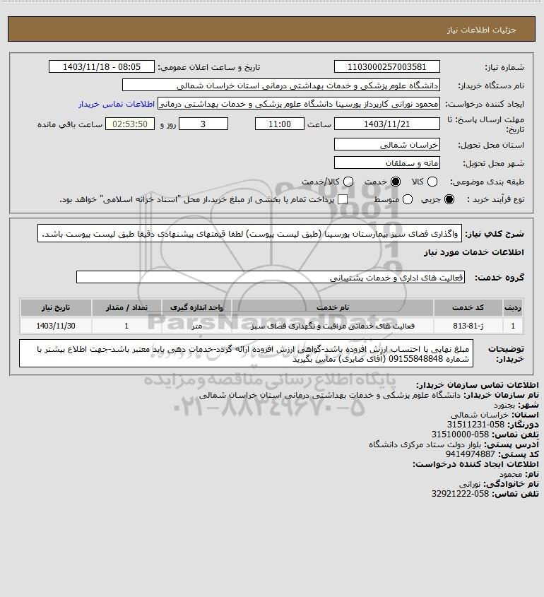 شرح کلی نیاز: واگذاری فضای سبز بیمارستان پورسینا (طبق لیست پیوست) لطفا قیمتهای پیشنهادی دقیقا طبق لیست پیوست باشد.