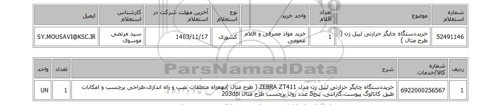 | 52491146 | خریددستگاه چاپگر حرارتی لیبل زن ( طرح متال ) | 1 | خرید مواد مصرفی و اقلام عمومی | کشوری | 1403/11/17 | سید مرتضی موسوی | SY.MOUSAVI@KSC.IR |
