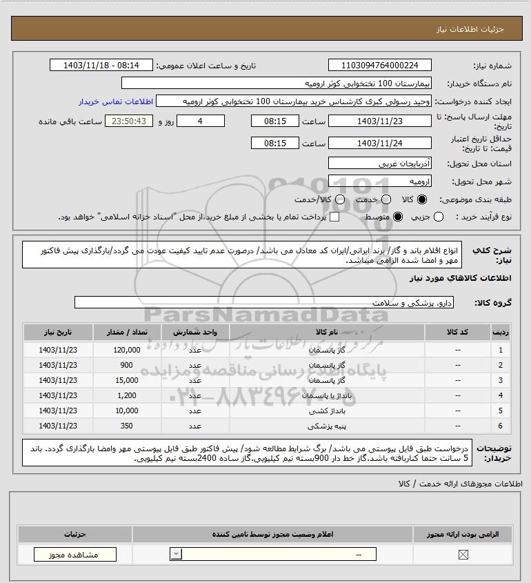 | 1 | -- | گاز پانسمان | عدد | 120,000 | 1403/11/23 |