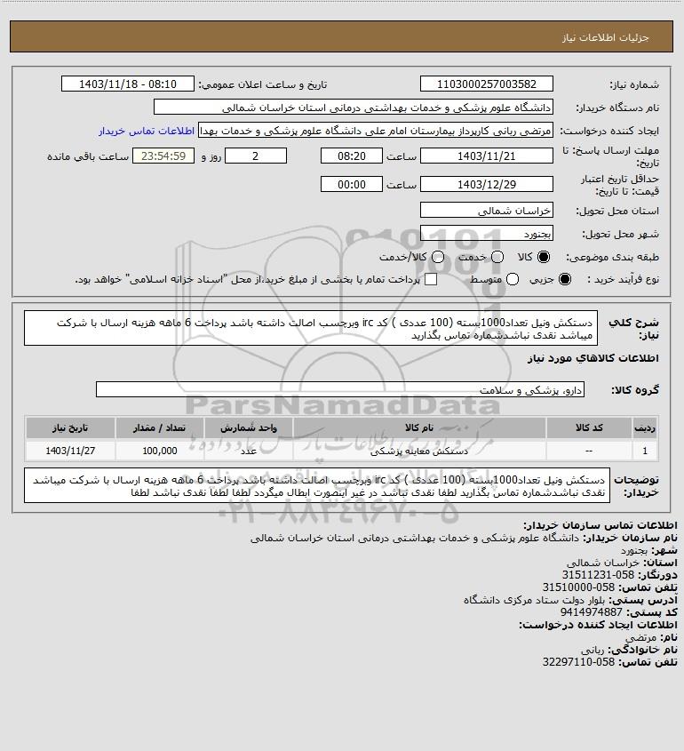 | 1 | -- | دستکش معاینه پزشکی | عدد | 100,000 | 1403/11/27 |