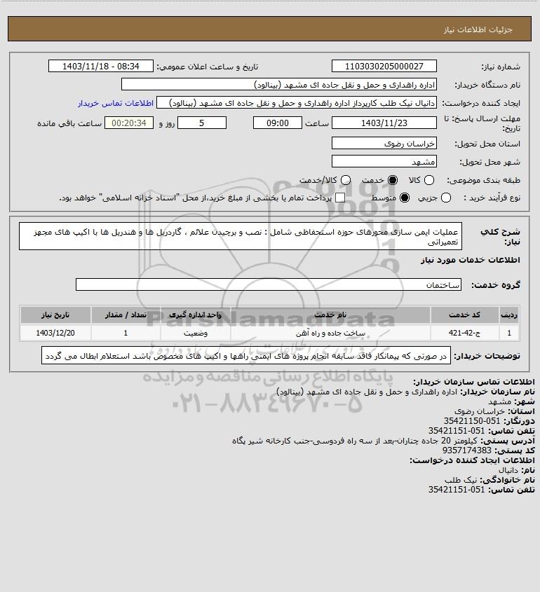 نام سازمان خریدار: اداره راهداری و حمل و نقل جاده ای مشهد (بینالود)