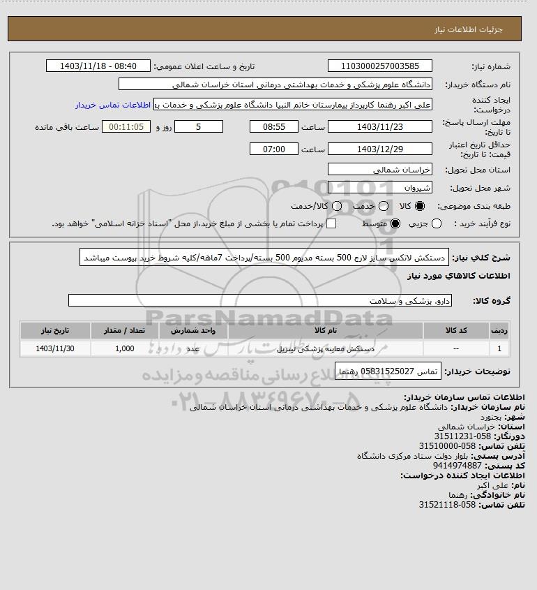 شرح کلی نیاز: دستکش لاتکس سایز لارج 500 بسته مدیوم 500 بسته/پرداخت 7ماهه/کلیه شروط خرید پیوست میباشد