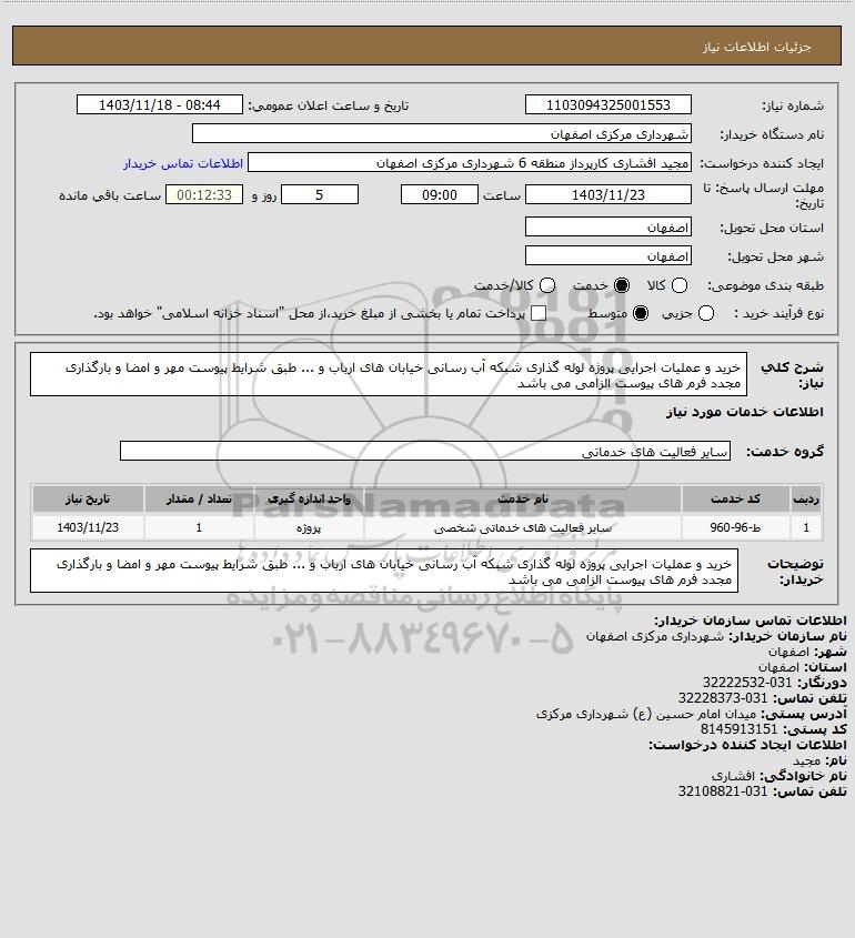 شرح کلی نیاز: خرید و عملیات اجرایی پروژه لوله گذاری شبکه آب رسانی خیابان های ارباب و ... طبق شرایط پیوست