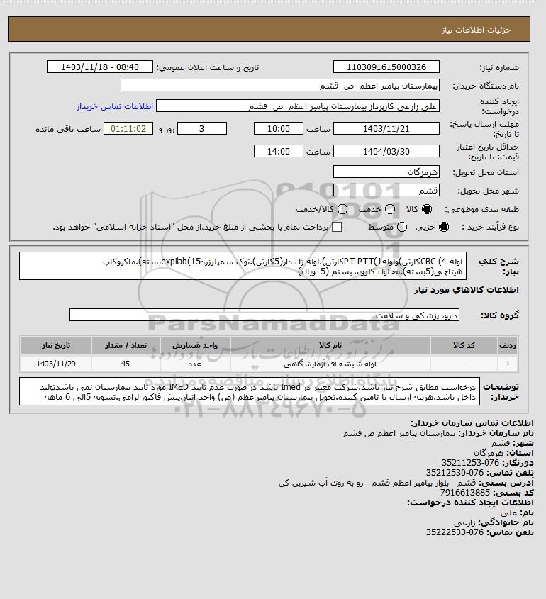 شرح کلی نیاز: لوله CBC (4کارتن)ولولهPT-PTT(1کارتن).لوله ژل دار(5کارتن).نوک سمپلرزردexpilab(15بسته).ماکروکاپ هیتاچی(5بسته).محلول کلروسیستم (15ویال)