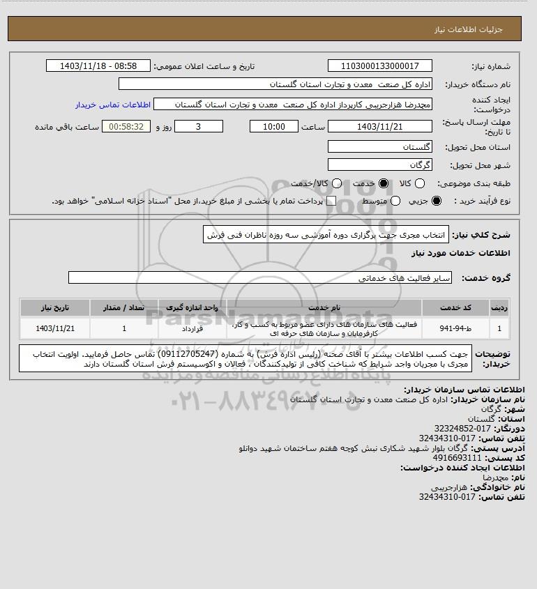 شرح کلی نیاز: انتخاب مجری جهت برگزاری دوره آموزشی سه روزه ناظران فنی فرش