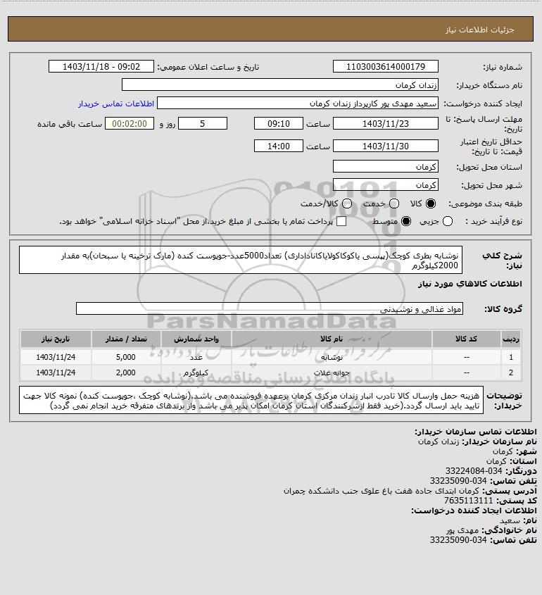 توضیحات خریدار:هزینه حمل وارسال کالا تادرب انبار زندان مرکزی کرمان برعهده فروشنده می باشد.(نوشابه کوچک ،جوپوست کنده) نمونه کالا جهت تایید باید ارسال گردد.(خرید فقط ازشرکنندگان استان کرمان امکان پذیر می باشد واز برندهای متفرقه خرید انجام نمی گردد)