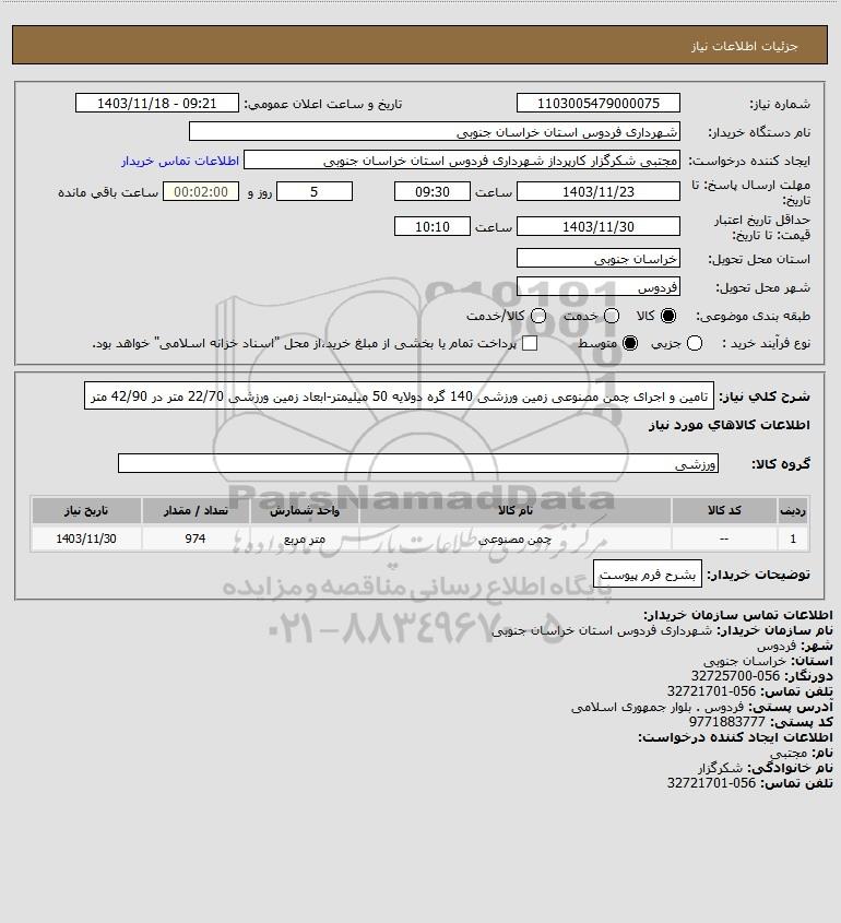 شرح کلی نیاز: تامین و اجرای چمن مصنوعی زمین ورزشی 140 گره دولایه 50 میلیمتر-ابعاد زمین ورزشی 22/70 متر در 42/90 متر