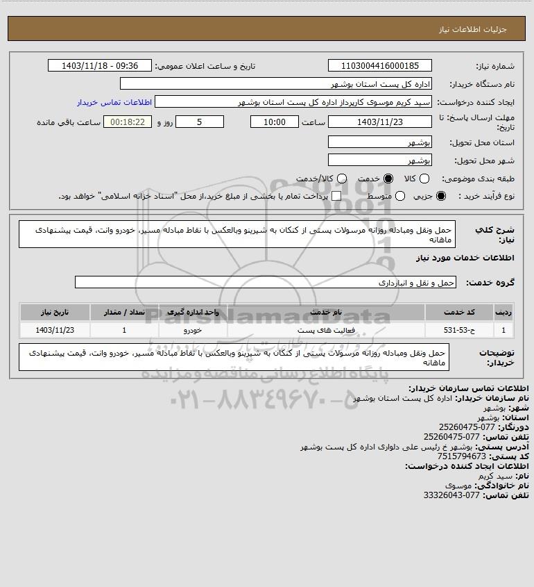 توضیحات خریدار:حمل ونقل ومبادله روزانه مرسولات پستی از کنکان به شیرینو وبالعکس با نقاط مبادله مسیر، خودرو وانت، قیمت پیشنهادی ماهانه