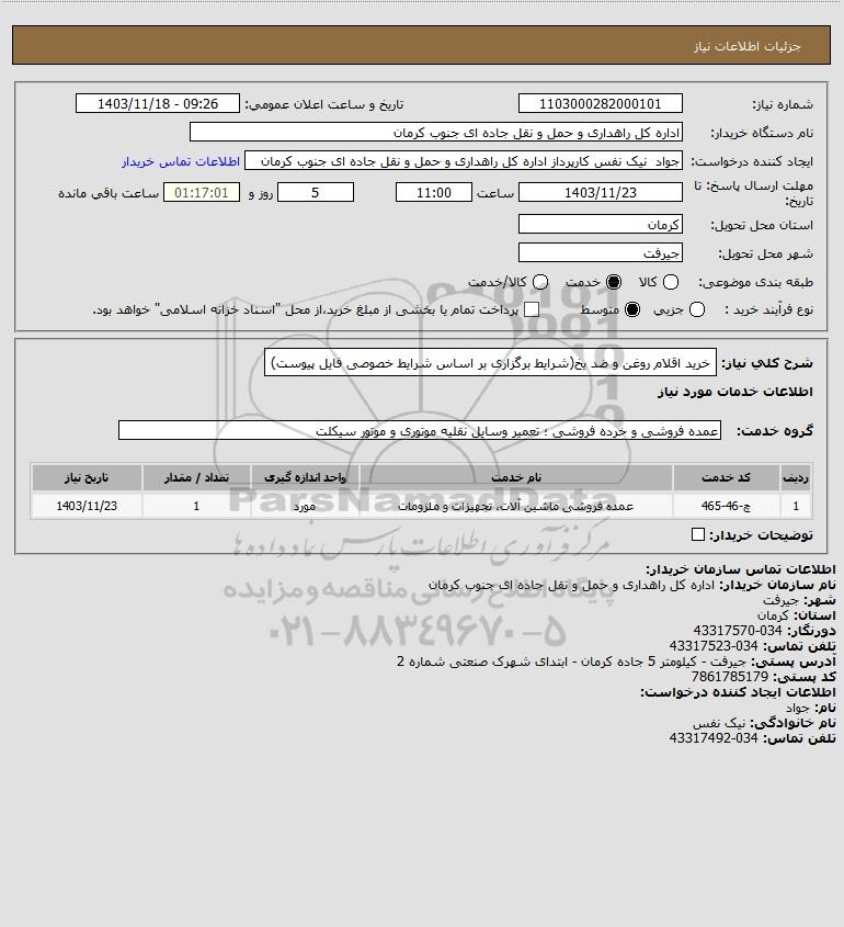 نام دستگاه خریدار:اداره کل راهداری و حمل و نقل جاده ای جنوب کرمان