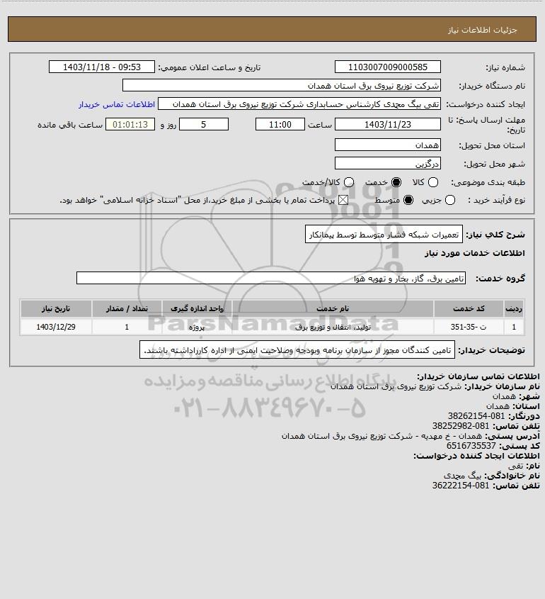 شرح کلی نیاز: تعمیرات شبکه فشار متوسط توسط پیمانکار