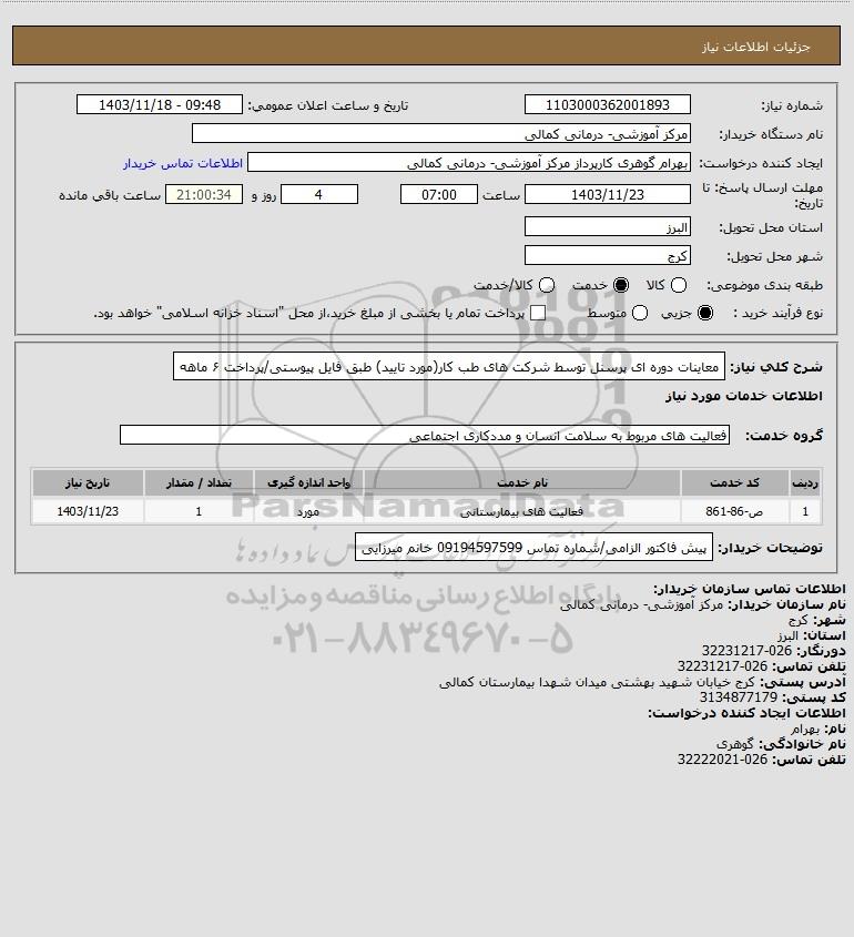 شرح کلی نیاز: معاینات دوره ای پرسنل توسط شرکت های طب کار(مورد تایید) طبق فایل پیوستی/پرداخت ۶ ماهه