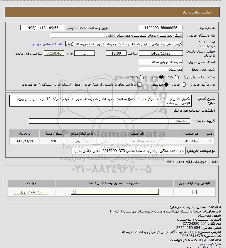 شرح کلی نیاز: تکمیل کامل زیست ماما مرکز خدمات جامع سلامت جدید اشار شهرستان مهرستان با پیشرفت 10 درصد
