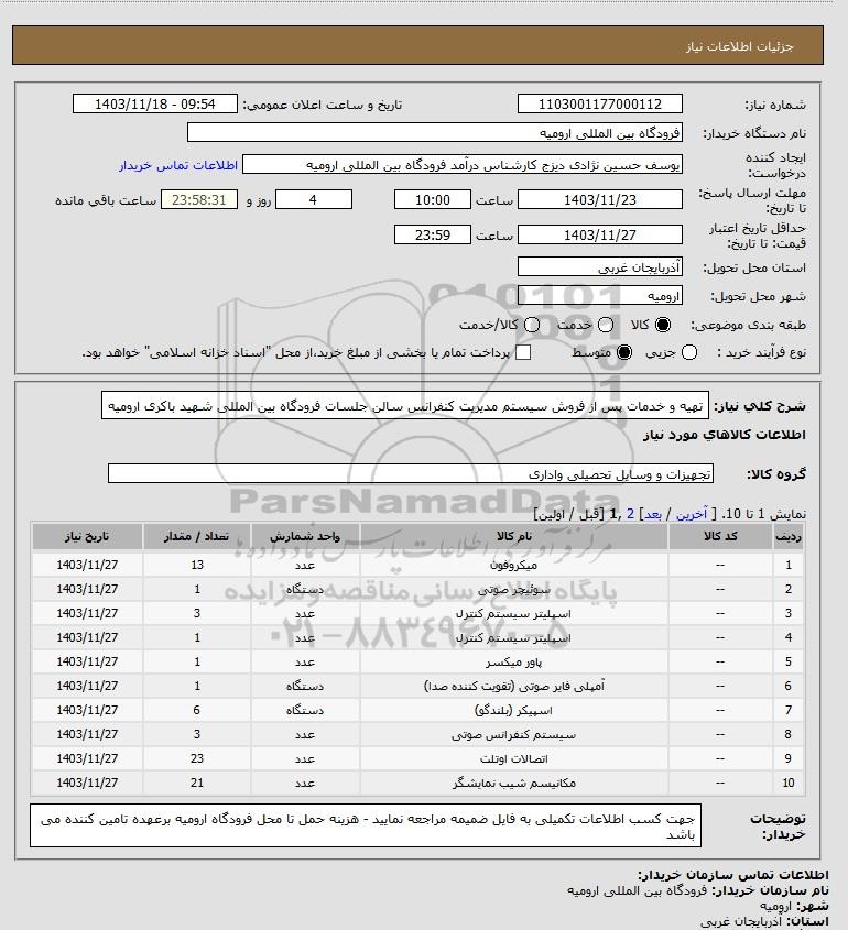 شرح کلی نیاز: تهیه و خدمات پس از فروش سیستم مدیریت کنفرانس سالن جلسات فرودگاه بین المللی شهید باکری ارومیه