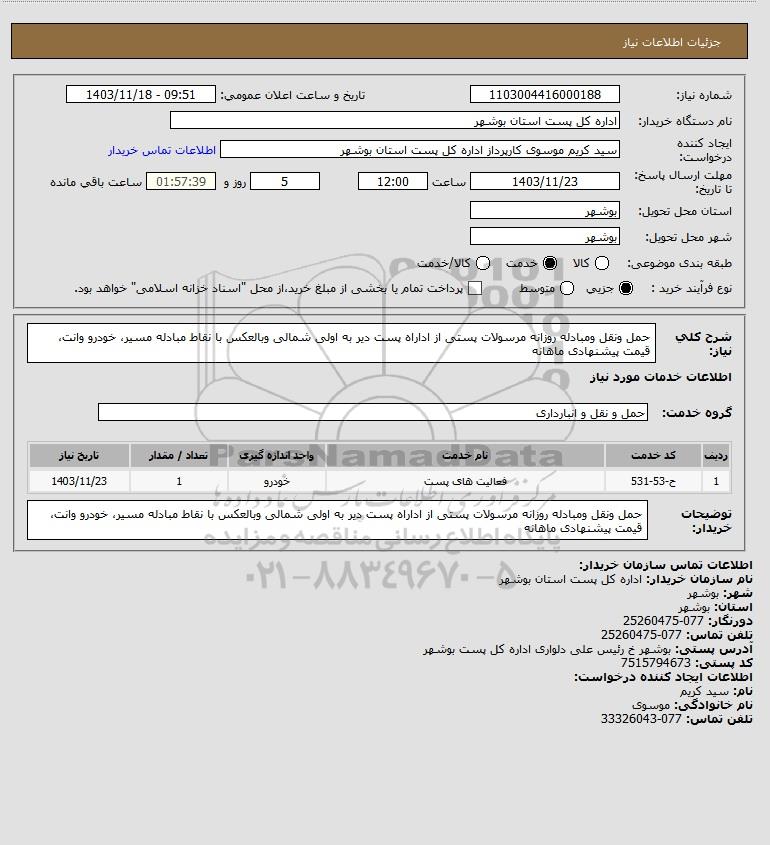 توضیحات خریدار:حمل ونقل ومبادله روزانه مرسولات پستی از اداراه پست دیر به اولی شمالی وبالعکس با نقاط مبادله مسیر، خودرو وانت، قیمت پیشنهادی ماهانه