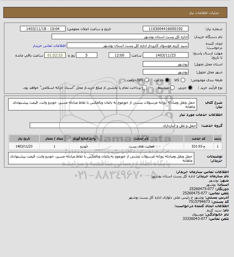 توضیحات خریدار:حمل ونقل ومبادله روزانه مرسولات پستی از خورموج به باغان وبالعکس با نقاط مبادله مسیر، خودرو وانت، قیمت پیشنهادی ماهانه