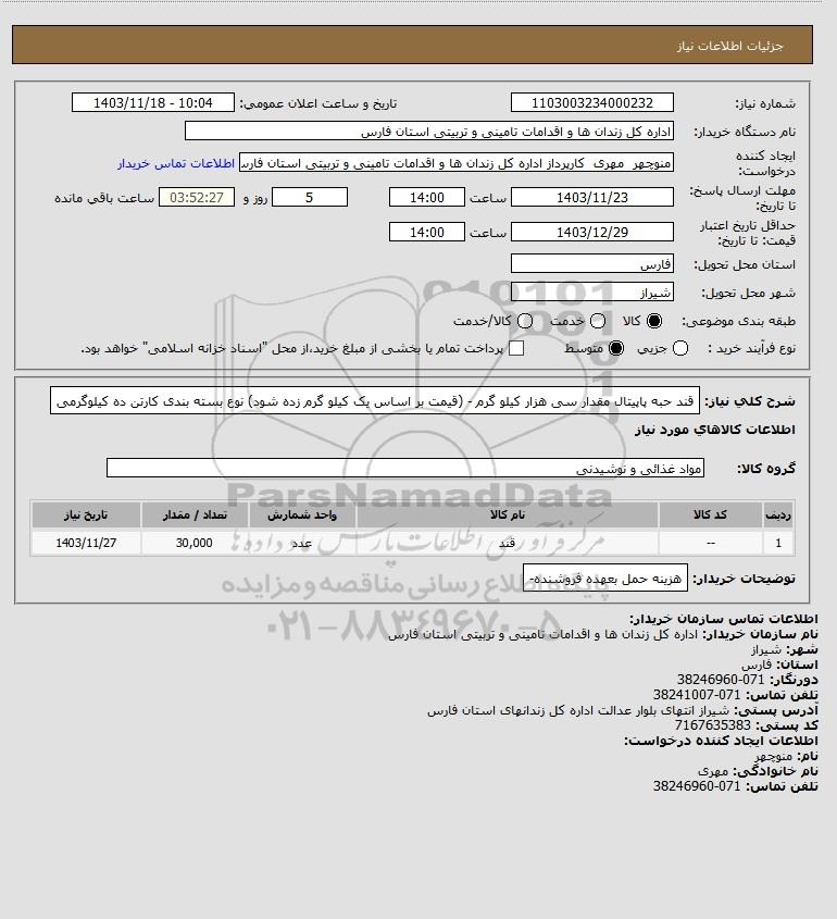 | 1 | -- | قند | عدد | 30,000 | 1403/11/27 |
